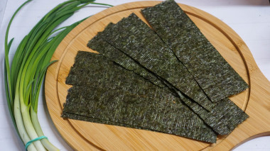 Нарежьте нори на полоски. Ширина одной полоски составляет примерно 3 см. На 2 порции мне понадобилось 10 таких полосок. Обратите внимание, что рис необходимо будет выкладывать на шершавую сторону нори.