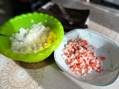 На этой неделе решили попробовать приготовить блюда азиатской кухни, на сайте нашла рецепт гунканы суши, и решила его приготовить. Листы нори нарезала на полоски, отварила и остудила рис. Курицу использовала отварную, филе нарезала на мелкие кусочки и смешала с соусом.