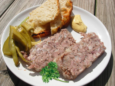 Моей семье, очень нравятся блюда из мяса. Решила приготовить прессованное мясо из свиной головы по данному рецепту. Следуя рецепту, получилась необыкновенно - вкусная закуска. Конечно же, приготовлению прессованного мяса, необходимо уделить много времени, но, того стоит. Подавала мясо с горчицей.