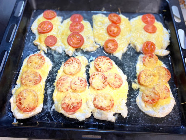 Куриная отбивная с помидором и сыром в духовке получилась сочная и мягкая. Рецепт сохранила. У нас получилось что-то вроде мяса по-французски.