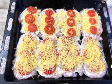 На сыр уложите по 2 кружочка помидора. Поставьте форму в разогретую до 180°С духовку и запекайте 20-30 минут до готовности курицы. Точное время запекания зависит от особенностей вашей духовки и от толщины куриных отбивных.