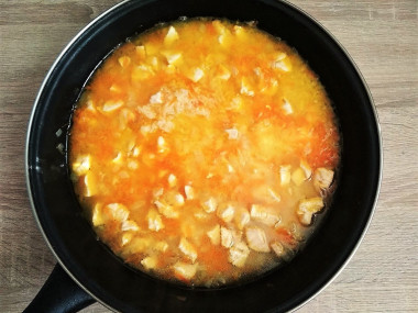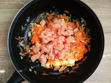 Мясо добавьте к луку с морковью, перемешайте. На среднем огне жарьте его ориентировочно 7-10 минут. Кусочки филе лучше чаще переворачивать, чтобы они хорошо прожарились со всех сторон.