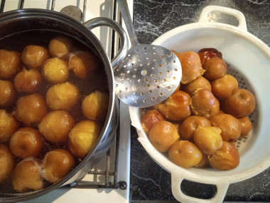 Бланшированные сливы выньте из воды шумовкой и откиньте на дуршлаг, чтобы с них стекла вода. Промойте банки с содой и простерилизуйте удобным для вас способом: в духовке, в микроволновке или на пару. Я использовала бутылки с широким горлышком. Крышки промойте с содой и прокипятите в течение 3-5 минут.