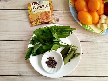 Кроме набора приправ добавила немного зелени, у меня была петрушка и несколько молодых листиков хрена. Зернистую горчицу люблю добавлять в маринады, она придает помидорам приятный привкус и предотвращает развитие микробов. В качестве консерванта использовала 2 ст. л. 9% уксуса на литр воды.