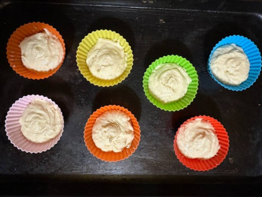 Возьмите жаропрочные порционные формочки для кексов. У меня силиконовые, поэтому я их ничем не смазывала, но если у вас металлические или керамические, слегка смажьте их дно и бока растительным рафинированным маслом. Наполните их тестом на 2/3 высоты. Если хотите, используйте одну большую форму для кекса, но в таком случае учтите, что время выпекания может увеличиться.