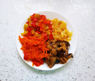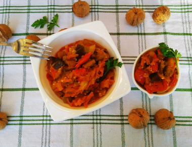 У меня с последнего сбора урожая осталось несколько баклажанов и болгарский перец. Решила сделать из них икру кусочками, нашла рецепт, только я не стала закатывать икру в банки. Просто приготовила на ужин вместо салата. Все овощи брала свежие, кроме помидоров. Они у меня были замороженные кружочками. Немного долго обжаривать все по отдельности, зато предварительное обжаривание дает очень приятный вкус, гораздо вкуснее сырого приготовления. Обычно икру пробиваю блендером, но попробовав ее на вкус, решила оставить кусочками. Все овощи прекрасно сочетаются, можно подать как салат, а можно в качестве второго блюда на ужин. Уксус не добавляла, порции хватило на пару дней.