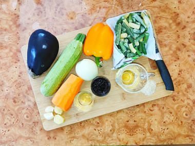 Морковку, чеснок и лук вымойте, обсушите и очистите от кожуры. У цукини и баклажана обрежьте места крепления плодоножки. Если кабачок не молодой, то срежьте с него кожицу и удалите семена. Болгарский перец разрежьте пополам, уберите сердцевину. У стручковой фасоли обрежьте хвостики с обеих сторон и удалите "усики". Всё тщательно ополосните в чистой воде и обсушите бумажными салфетками.