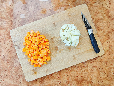 В сковороде с толстым дном разогрейте растительное масло. Отправьте лук и морковку обжариваться первыми. Постоянно помешивая, готовьте до тех пор, пока лук не зарумянится.