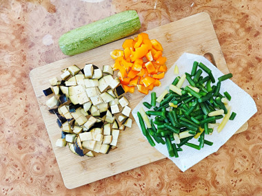 Баклажан и болгарский перец измельчите такими же кубиками, как морковку с луком. Если овощи нарезать одинаково, то они более аппетитно и красиво будут смотреться в вашей тарелке. Стручки фасоли нарежьте небольшими фрагментами.