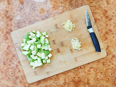 Корень имбиря очистите и натрите на мелкой тёрке. Чеснок нарубите ножом или пропустите через пресс. Цукини нарежьте некрупно.