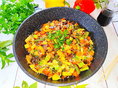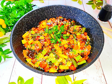 Порадовала своих близких восточной ноткой в повседневном меню! Овощи в соевом соусе можно готовить по-разному. Сегодня я приготовила овощи в соевом соусе на сковороде. Блюдо получилось очень ароматным, острым, дополнительно при подаче его посыпала натертым чесноком и зеленью.Мы в восторге о этого рецепта! Огромное спасибо!