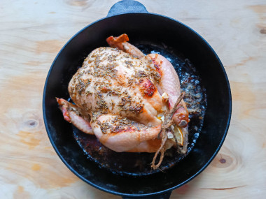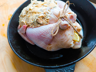 Свяжите ножки курицы шпагатом. Поставьте форму в разогретую до 180°С духовку примерно на 1 час. Запекайте до появления золотистой корочки. Может потребоваться чуть больше времени, в зависимости от духовки. Я запекала на режиме верх+низ+конвекция. Периодически поливайте курицу соком со дна формы.