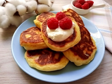 Готовые пышные оладьи с творогом без молока выложите на бумажные салфетки, чтобы они впитали лишний жир. Приятного аппетита!