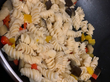 Дальше была очередь макарон. Воды влила немного и ждала когда же она впитается макаронами. Периодически помешивала. Воду пришлось добавить еще и накрыла макароны крышкой. Огонь поставила на минимум. Спустя примерно минуту крышку сняла, добавила овощи и еще немного подержала все вместе на плите.