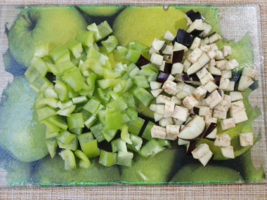 Овощи помойте под проточной водой, обсушите. С баклажана срежьте зеленую часть, нарежьте овощ средними кубиками.