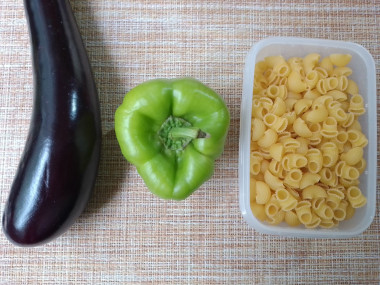 Как сделать макароны с овощами на сковороде? Подготовьте необходимые ингредиенты. Макароны могут быть любой формы, желательно среднего размера и обязательно из твердых сортов пшеницы. Овощи можно выбрать любые. У меня баклажан и болгарский перец красного, желтого и оранжевого цветов.