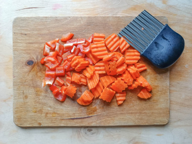 Болгарский перец очистите от семян и плодоножки, нарежьте небольшими кубиками.