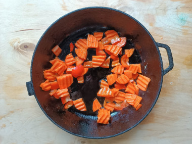 Готовые овощи выложите в отдельную тарелку. На эту же сковороду насыпьте макароны.