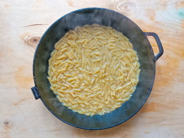 Заранее вскипятите воду. Залейте макароны кипятком, чтобы они были лишь покрыты водой. Посолите, накройте сковороду крышкой.