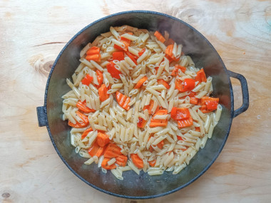 Захотелось приготовить какой-нибудь простой и в то же время необычный гарнир. Выбрала рецепт макарон с овощами на сковороде. Из овощей взяла болгарский перец и морковь. Морковь нарезала фигурным ножом. Обжаривала овощи около 10 минут на чугунной сковороде до мягкости моркови. Из специй и пряностей добавила соль, перец и смеь кавказских трав. Макароны использовала перья. Варила макароны, помешивая, примерно 4 минут до состояния al dente.