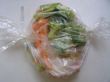 Разделите брокколи на соцветия средних размеров и промойте их Очистите морковь, обмойте и нарежьте ее на длинные полоски вдоль. Сельдерей промойте и разделите стебли на полоски средней длины. Не режьте овощи мелко, а то они развалятся при запекании. Лучше потом в тарелке уже нарезать кусочки нужной величины. Переложите все овощи в отдельную емкость, посолите по вкусу, добавьте любые специи по вкусу, добавьте растительное масло и перемешайте.