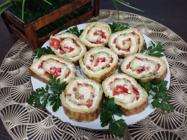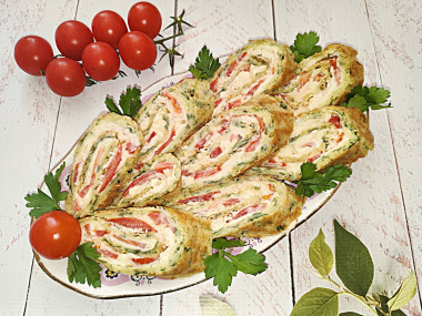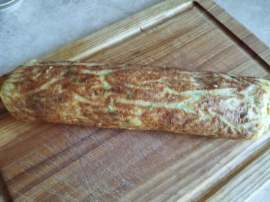 На остывший корж выложила сырную начинку,помидоры и аккуратно свернула рулетом. Завернула в фольгу и убрала в холодильник на 2 часа.
