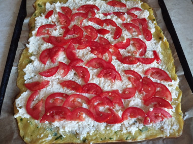 Выложила тесто на противень, застеленный пергаментом и запекла в духовке 30 минут при 180°. Пока корж выпекался, приготовила начинку. Сыр натерла на тёрке,добавила сметану( заменила майонез), измельчённый чеснок и перемешала. Помидоры нарезала полукольцами.