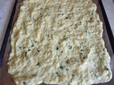 Соедините кабачок с яйцами и зеленью, перемешайте. Смешайте муку с содой и просейте. Всыпьте муку в овощную смесь и замесите тесто, тщательно перемешивая. Тесто должно получиться достаточно густым. Застелите противень пергаментом и обильно смажьте её растительным маслом. Вместо бумаги можно воспользоваться силиконовым или тефлоновым ковриком. Вылейте тесто на подготовленный противень и равномерно распределите его тонким слоем толщиной около 1 сантиметра.