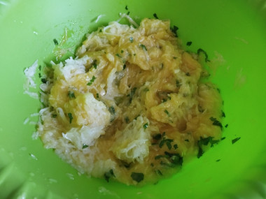 Решила приготовить рулет из кабачков с помидорами в качестве закуски. Кабачок очистила и натерла на мелкой тёрке. Руками отжала,сок слила. В отдельной миске взбила яйца с измельчённой зеленью петрушки и добавила к кабачку. Затем добавила муку с содой и всё вместе перемешала.