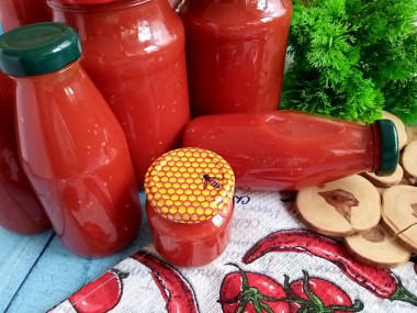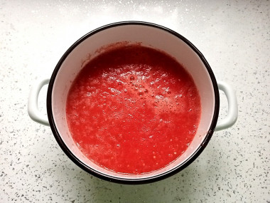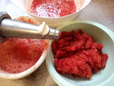 На мясорубку я надела специальную насадку для выжимания сока. Правда немного семечек проскочило, но это не критично. Полученный сок проварила минут 15-20 после закипания пока пена из розовой ни стала красной. Сахара добавила побольше, помидоры у меня кисленькие оказались.
