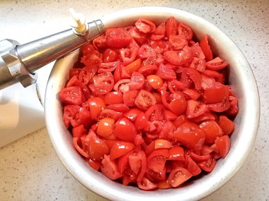Помидоры разрежьте на четвертинки, чтобы их было удобно пропускать через мясорубку. Прокрутите их через мясорубку. Если у вас самая обычная мясорубка и в соке остались семечки, то можно пропустить сок через сито или оставить как есть.