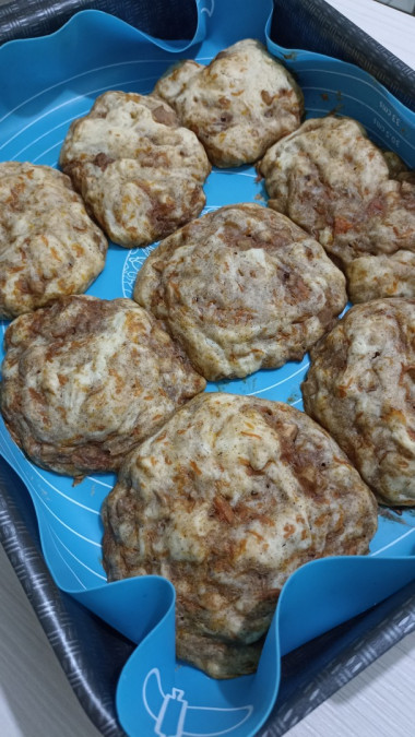 На противень, застеленный силиконовым ковриком, порционно выкладываю ложкой готовую смесь и в виде булочек.