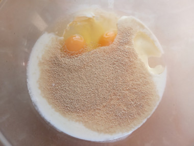 Для приготовления теста немного подогрейте кефир до чуть теплого состояния. Налейте его в чашу, в которой будете готовить тесто. Разбейте два яйца.