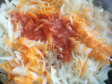 Морковь очистите, натрите на терке и добавьте к капусте. Полейте томатным соком. По вкусу посыпьте солью и молотым перцем. Перемешайте и тушите ещё минут 10, но уже без крышки, чтобы испарилась лишняя влага.