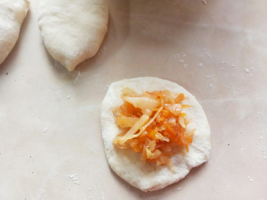 Поделите тесто на части, сформируйте небольшие лепешки. В центр каждой выложите начинку, залепите края и сформируйте пирожок.