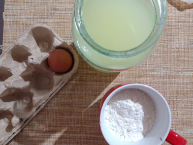 2. В простоквашу вбить яйцо, всыпать соль и соду. Полученную смесь перемешать до однородности миксером на небольших оборотах или просто венчиком.