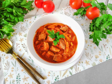 Гуляш любят и взрослые и дети, а по этому рецепту при приготовлении в мультиварке мясо получается особенно нежным, мягким. Овощи для подливки придают мясу неповторимый вкус и аромат. Сочный и вкусный гуляш отлично сочетается с макаронами и картофельным пюре, особенно вкусное дополнение – это подливка. Я ничего не меняла в этом рецепте, мне очень нравится гармоничный набор овощей и мяса, дополняющих и подчеркивающих вкус друг друга. Доступное подробное описание, сопровожденное красивыми фотографиями, что ещё нужно для кулинарного вдохновения. Только хорошее настроение и желание приготовить это яркое, сочное, наваристое блюдо.