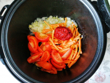 Добавьте томатную пасту. Все тщательно перемешайте и тушите еще 5-7 минут. Если у вас нет томатной пасты, можете заменить ее кетчупом.