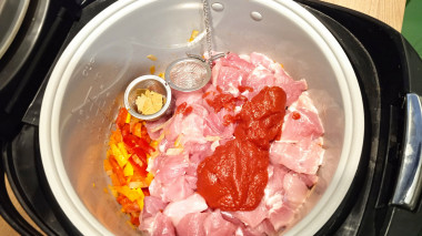 Как сделать гуляш из свинины с подливкой в мультиварке? Очень просто. Для начала подготовьте все необходимые ингредиенты по списку. Растительное масло можете брать любое по вкусу, у меня подсолнечное. Помимо указанных специй можете использовать свои по вкусу.