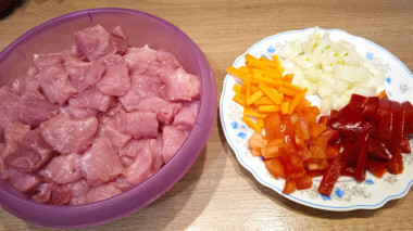 Свинину вымойте, обсушите и нарежьте средними кусочками. Свиную мякоть можете брать от любой части туши: окорок, лопатка или нежная вырезка, как у меня.