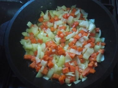 В сковороде на среднем огне разогрейте сливочное масло. Выложите лук с морковью и обжарьте, помешивая, примерно 5-6 минут. По желанию можете не обжаривать овощи, а выложить их в суп свежими вместе с картофелем и варить до готовности. А кусочек сливочного масла добавить вместе со сливками в конце варки.