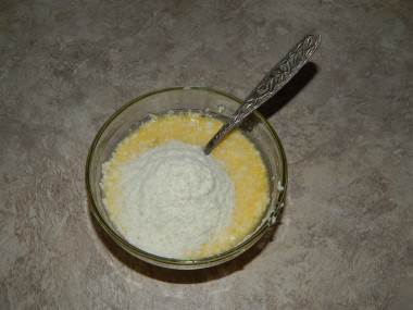 Следом всыпьте в чашу крахмал и рисовую муку. Все ингредиенты смешайте между собой. Если у вас творог более влажный, то крахмала может понадобиться больше. Смотрите по консистенции творожной массы.