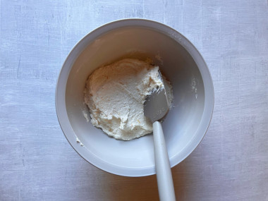Все смешанные ингредиенты пробейте погружным блендером. Творожная масса станет более однородная, пластичная и легко будет собираться в общий комок.