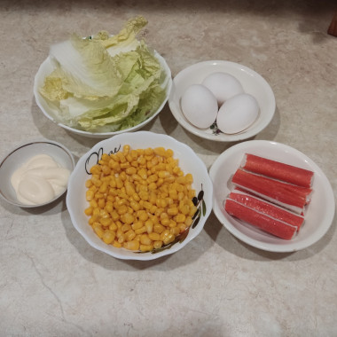 В салатнике соедините крабовые палочки, пекинскую капусту, консервированную кукурузу и яйца. При желании можно добавить измельченную зелень укропа или петрушки.