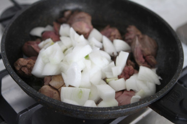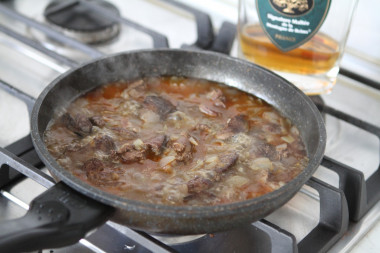 Добавить нарезанную печень. Обжарить. Посыпать тимьяном. Обжаривать до румяной корочки и розовинки в середине. Поджечь бренди в отдельной емкости, чтобы весь алкоголь выгорел. Добавить бренди к печени. Обжаривать еще 1 минуту.