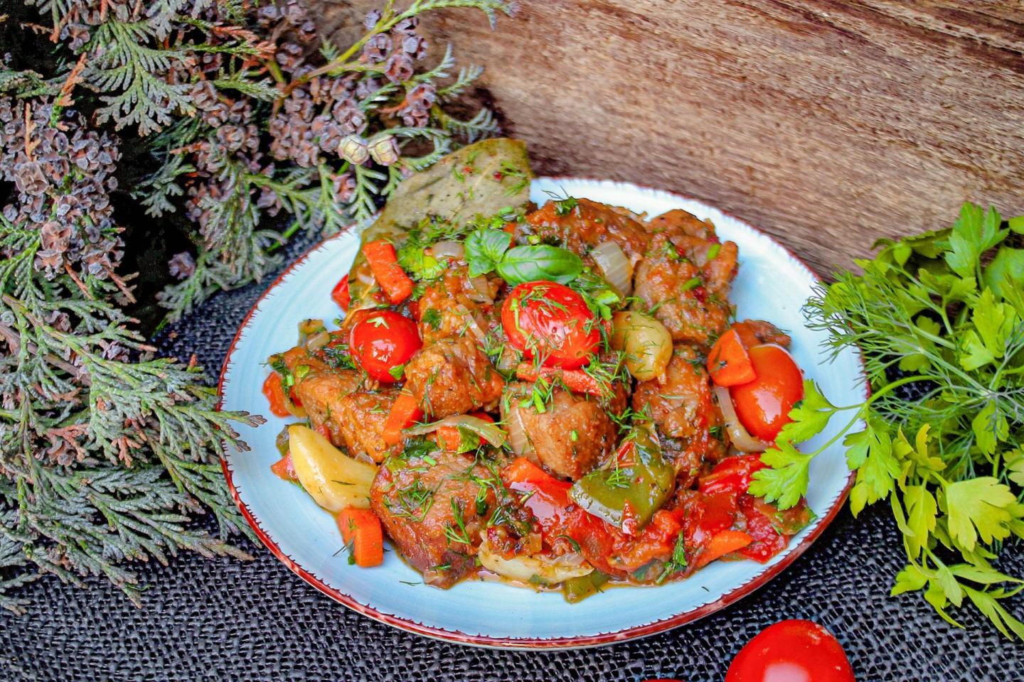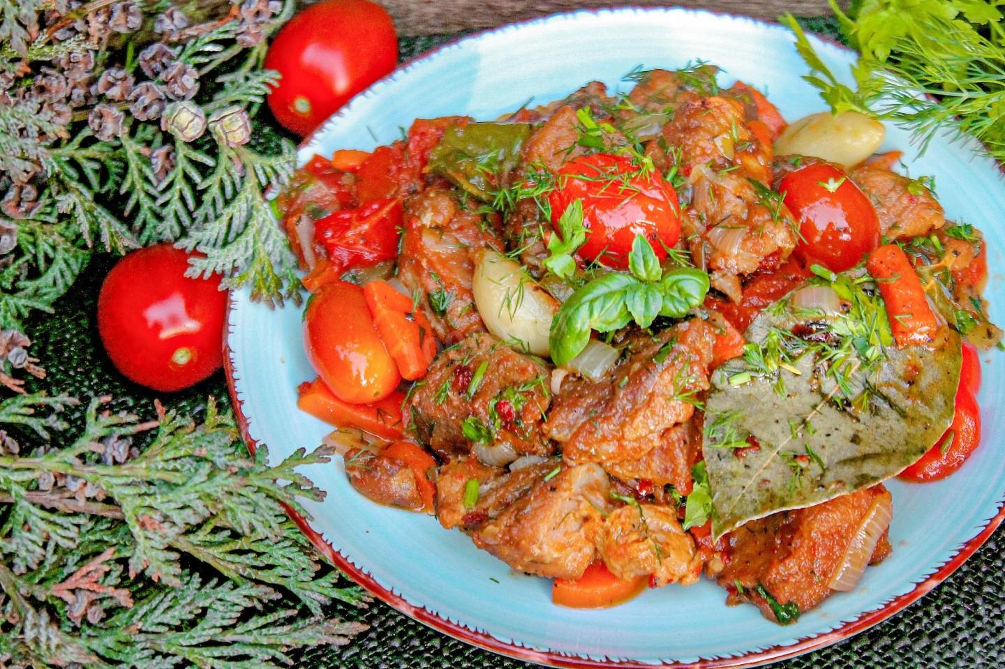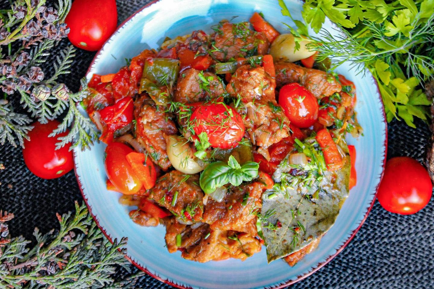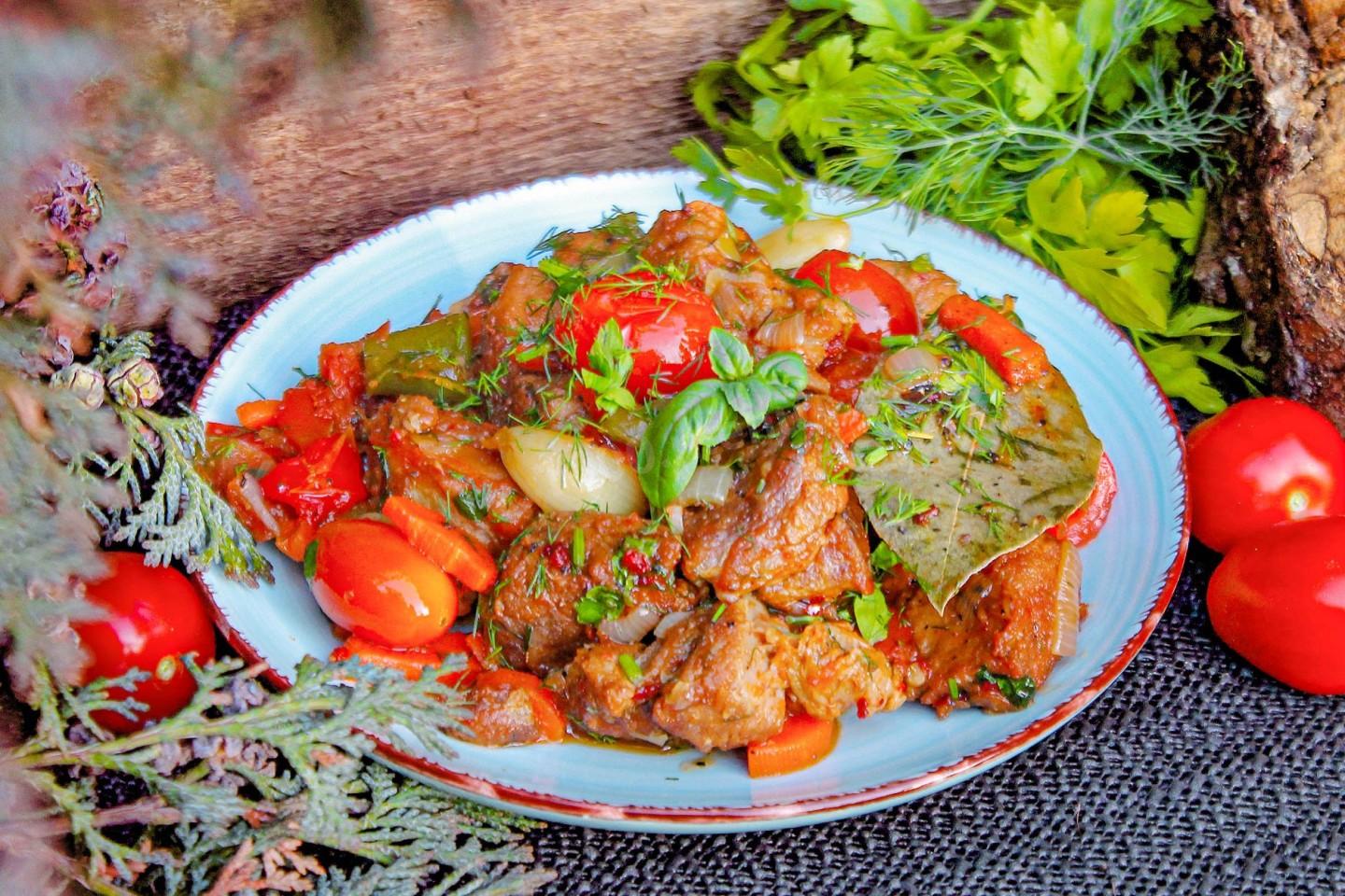 Подготовьте ингредиенты. Какая часть свинины лучше всего подходит для тушения в казане? Для приготовления свинины в казане на костре лучше всего использовать шейную часть свинины. Она более нежная и мягкая, блюдо получается сочным и очень вкусным. Подготовьте овощи и зелень. Нам потребуются перец болгарский, лук, морковка и помидоры, добавьте обязательно чеснок и лавровый лист для аромата, а так же свежую зелень.