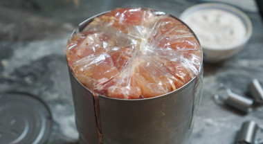 Далее уложила ветчинницу на противень, предварительно застелив его фольгой. Оставила выпекаться в течении 2,5 часов, постепенно увеличивая температуру от 100 градусов до 160. По истечении 2,5 часов, оставила ветчинницу в духовке до полного остывания, далее убрала в холодильник на ночь. За время выпекания в духовке, за счет сжимания пружин, ветчина сжалась в размере примерно на четверть.