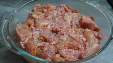 Подготовила ингредиенты по списку, из мяса взяла 1 кг свиной лопатки и 400 грамм филе куриных бедер. Мясо нарезала кусочками, посолила. Использовала обычную соль и нитритную в равных частях. Мясо накрыла пищевой пленкой и оставила в холодильнике мариноваться на 1,5 суток. Далее четверть мяса перемолола блендером, добавила немного ледяной воды и смешала с основной массой.