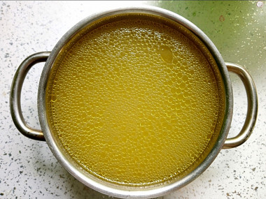 Поэтому я дополнительно процедила бульон, застелив мелкое сито двойной тканевой салфеткой. Вот какой он получился, прозрачный, яркий и наваристый.