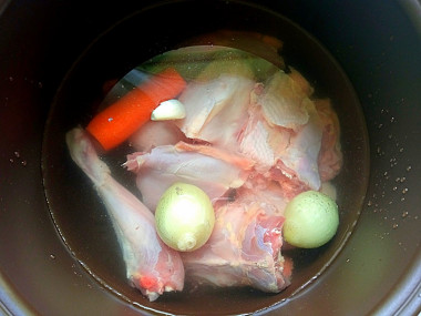 Мультиварку я только осваиваю, решила попробовать сварить в ней суп, точнее бульон. Нашла рецепт куриного бульона в мультиварке и начала набираться опыта) Для бульона специально купила небольшую тушку цыпленка весом 750 г. Разрезала ее на части, добавила пару маленьких луковиц и морковку. Потом решила ещё зубчик чеснока добавить для аромата. Лавровый лист не стала добавлять к курице, как и специи. Бульон мне нужен был для болеющего сына. Воды налила 1,5 литра, как и указано в рецепте. Вода фильтрованная, для бульона это важно, мне кажется. Установила режим "суп" на 1,5 часа. Это удобно, не нужно стоять над кастрюлей и регулировать процесс. После окончания программы оказалось, что половина воды выкипела, поэтому добавила ещё пол литра воды и довела до кипения. Заметила, что свернувшийся белок плавает в бульоне, но об этом автор предупредила. Процедить бульон вообще не проблема) Кстати, чаша мультиварки отмылась моментально, это очень порадовало!